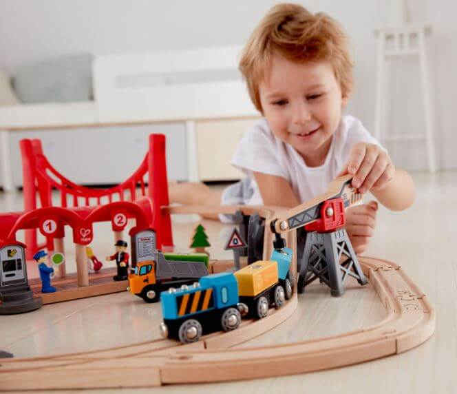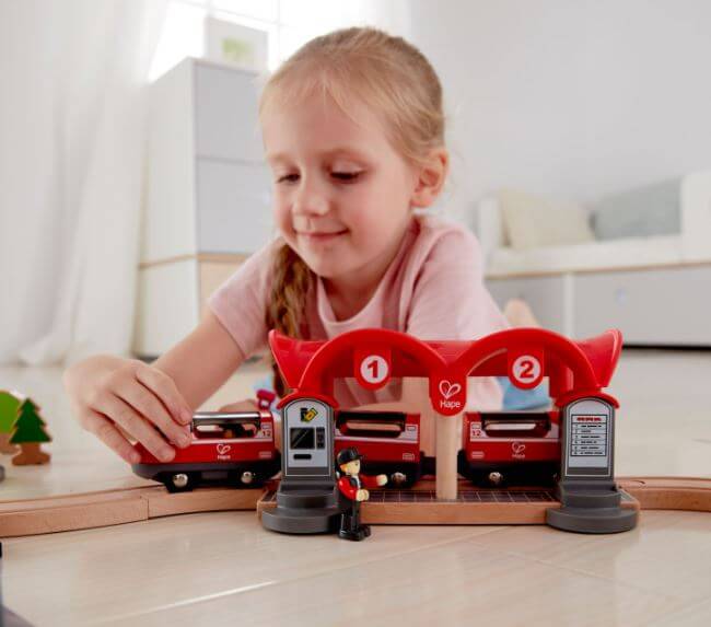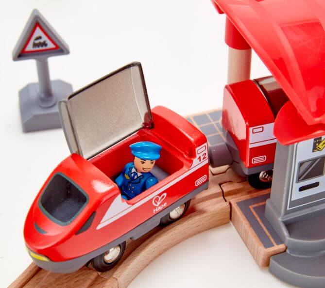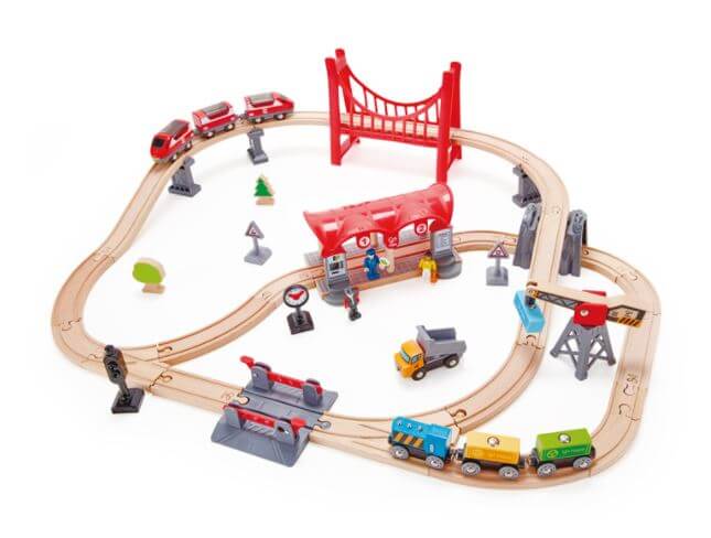 Train tracks aren’t just for passenger trains. There’s freight to deliver, too! This complete city-themed rail set features a passenger and a freight train, a station, automatic gates, a bridge and much more!