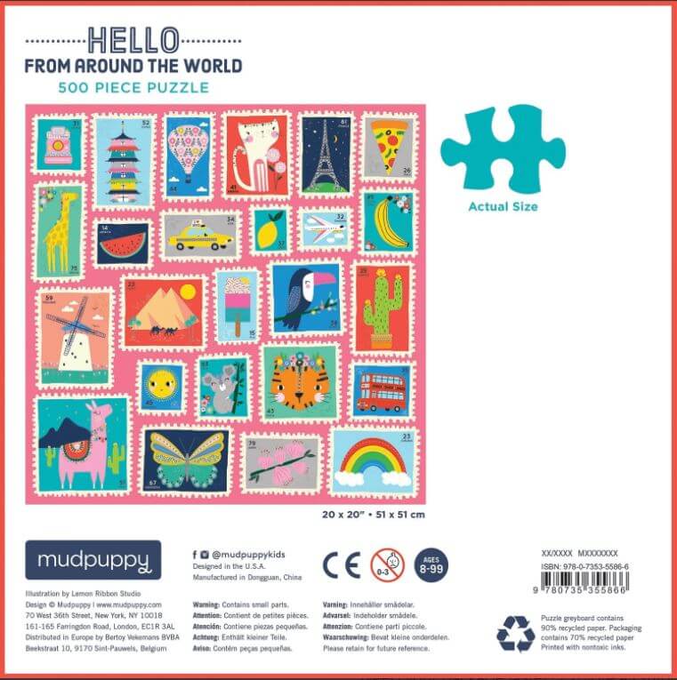 – Puzzle greyboard contains 90% recycled paper. Packaging contains 70% recycled paper. Printed with nontoxic inks.
