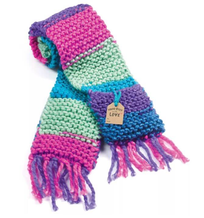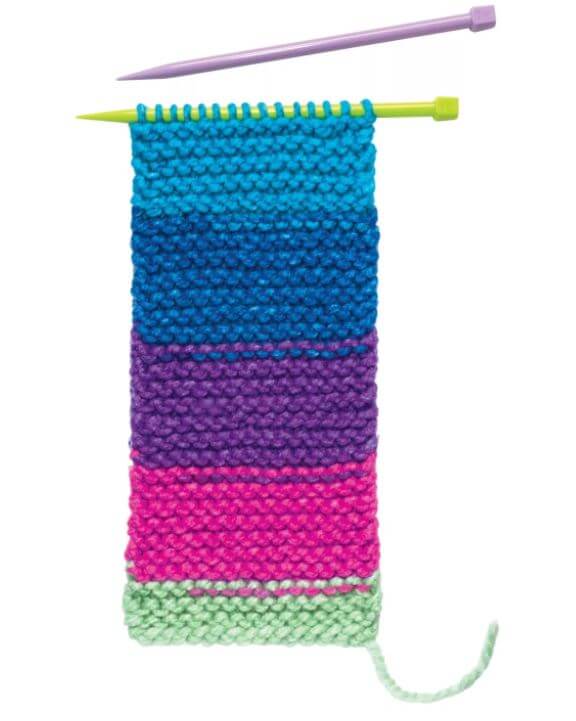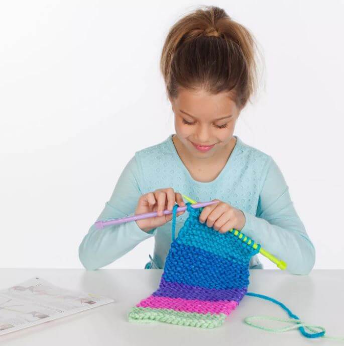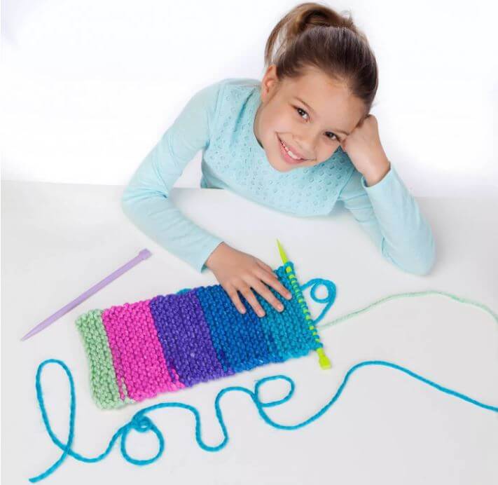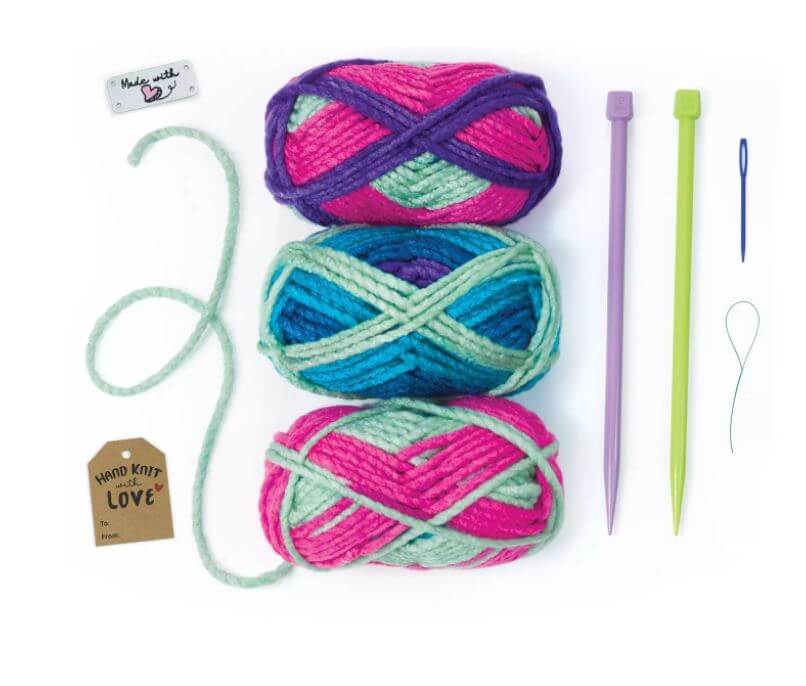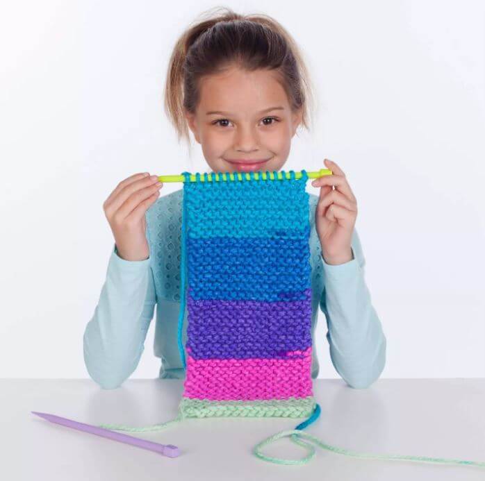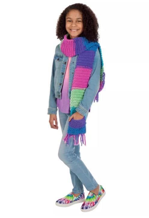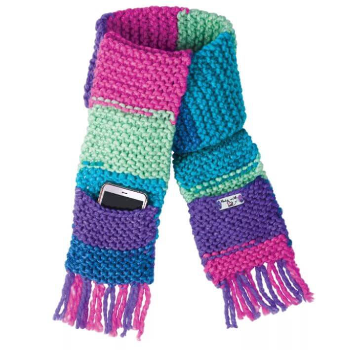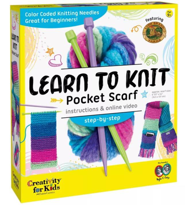 Make your own pocket scarf that you can store your phone in with Creativity for Kids Learn to Knit Pocket Scarf! Using illustrated instructions, online video and color-coded knitting needles beginners can learn how to wind and loop chunky yarn to create a scarf. Knitting is a mindful and relaxing activity for kids ages 9+ to complete independently and inside. When you finish knitting your button scarf you can wear it around your neck like a true fashionista and store your belongings in the pocket you attach!