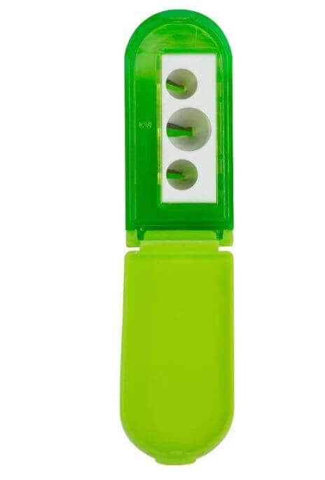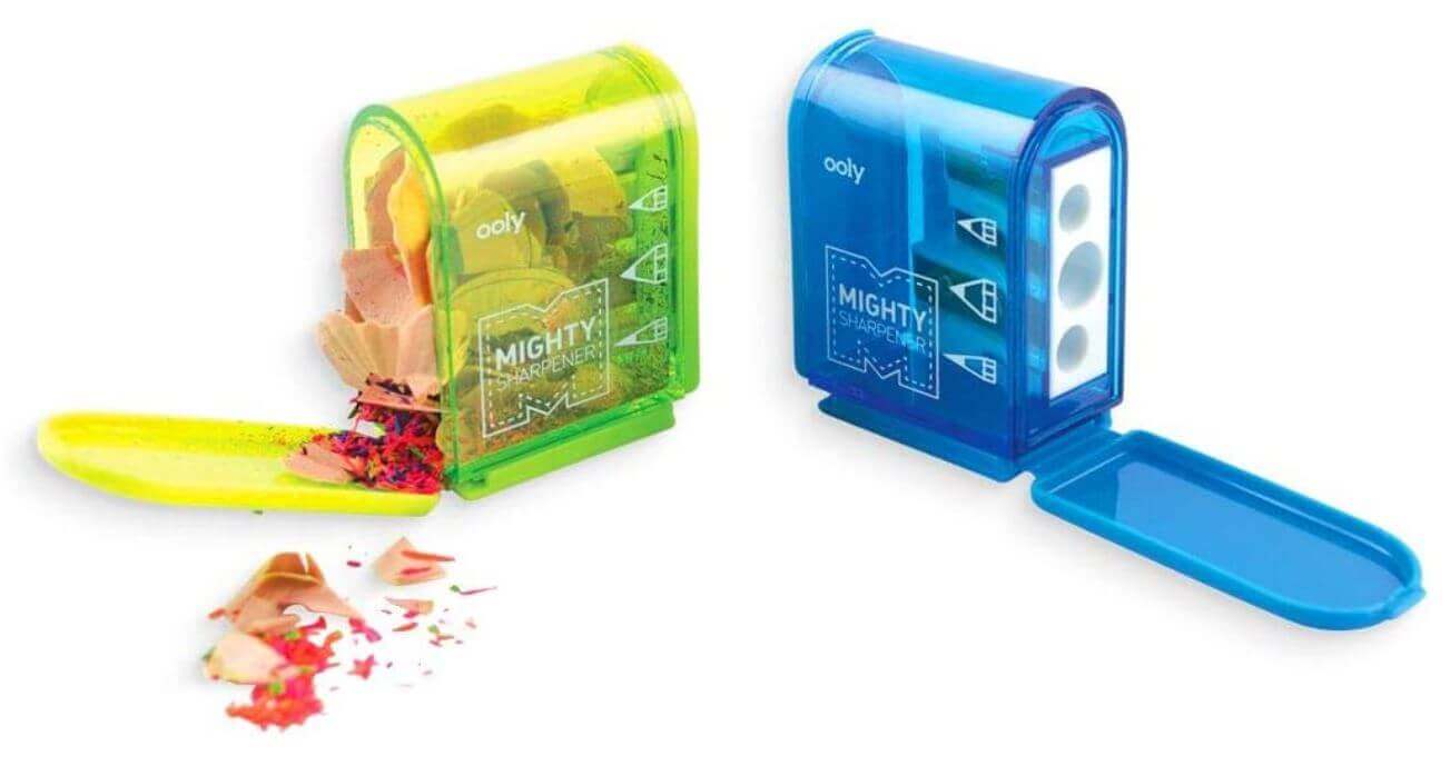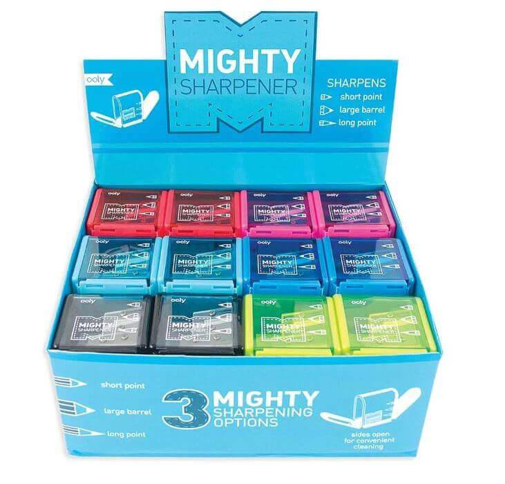 3 HOLE SHARPENER – The Mighty Pencil Sharpener is mighty indeed. With three different hole sizes and a large reservoir for the shavings, you can tote this little buddy anywhere.