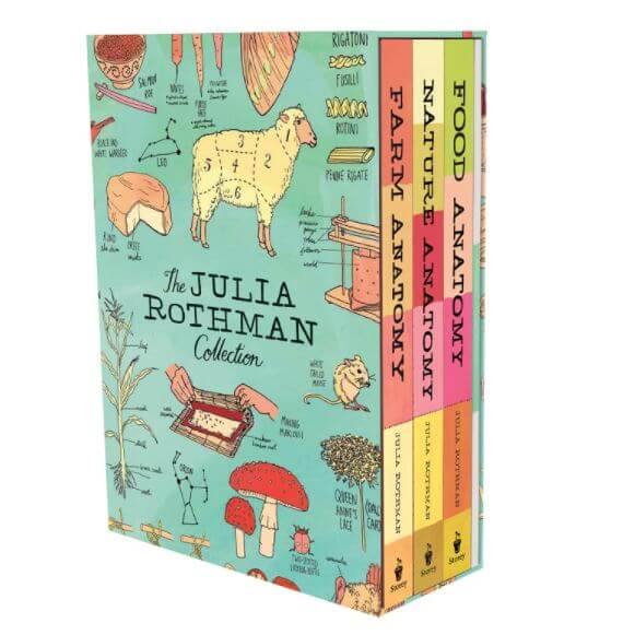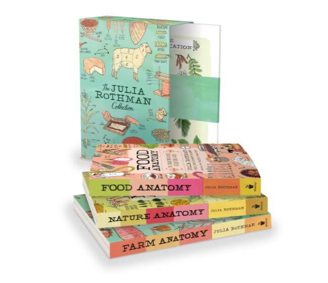 This handsome box set provides hours of enlightening entertainment for those curious about farm life, the natural world, and food. Best-selling author and illustrator Julia Rothman presents Farm Anatomy, Nature Anatomy, and Food Anatomy in a specially designed slipcase with 10 framable prints. Rothman’s popular line drawings offer a whimsical and educational guide to life on a farm, nature’s hidden wonders, and delectable tidbits from kitchens and pantries around the globe.